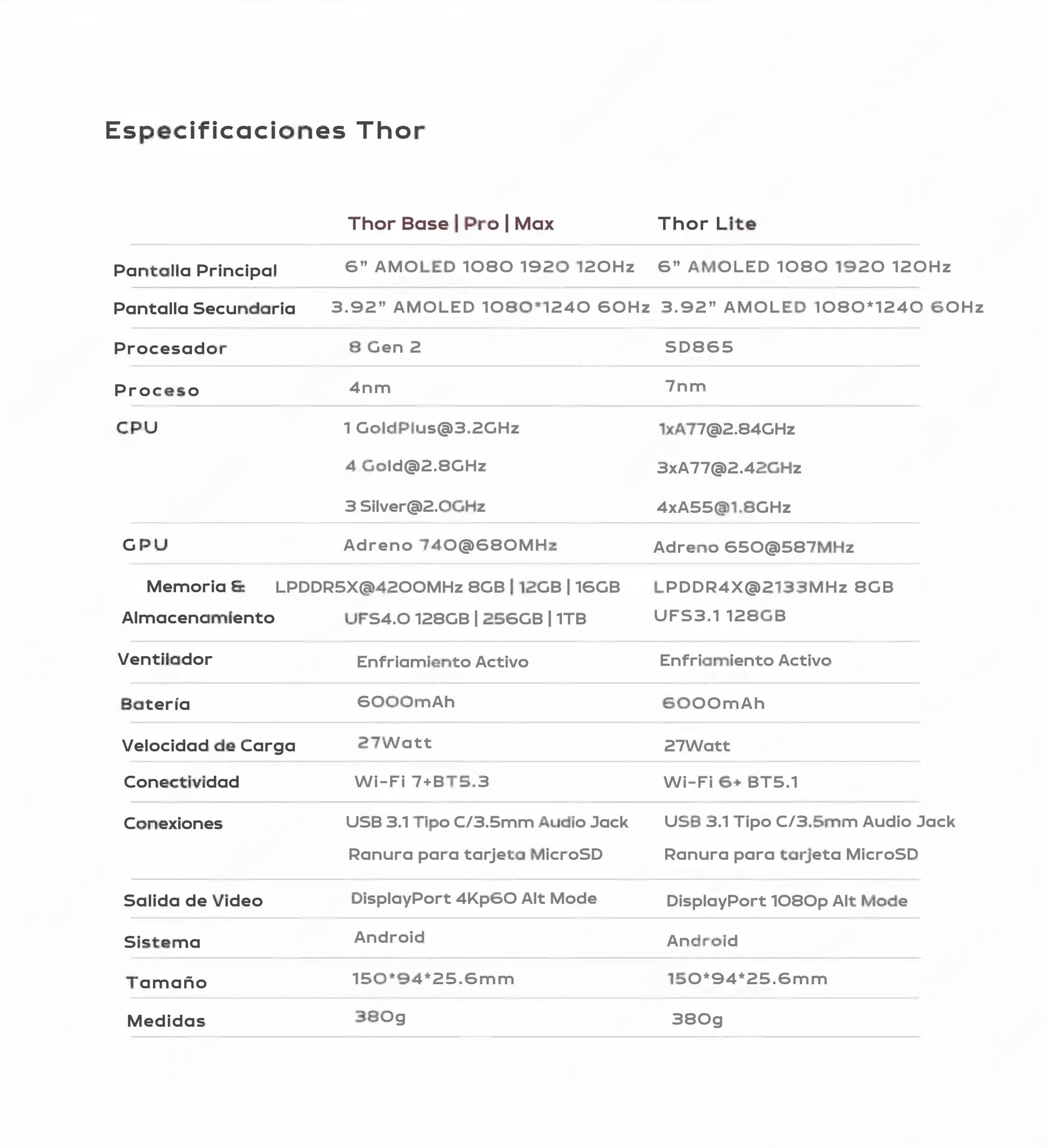 Conprocesador Snapdragon 865, pantalla principalAMOLEDde 6″, pantalla secundaria de 3,92″, batería de6000 mAhy sistemaAndroid, esta consola está diseñada para quienes buscan poder retro en undiseño compacto, sin renunciar alrendimiento moderno.